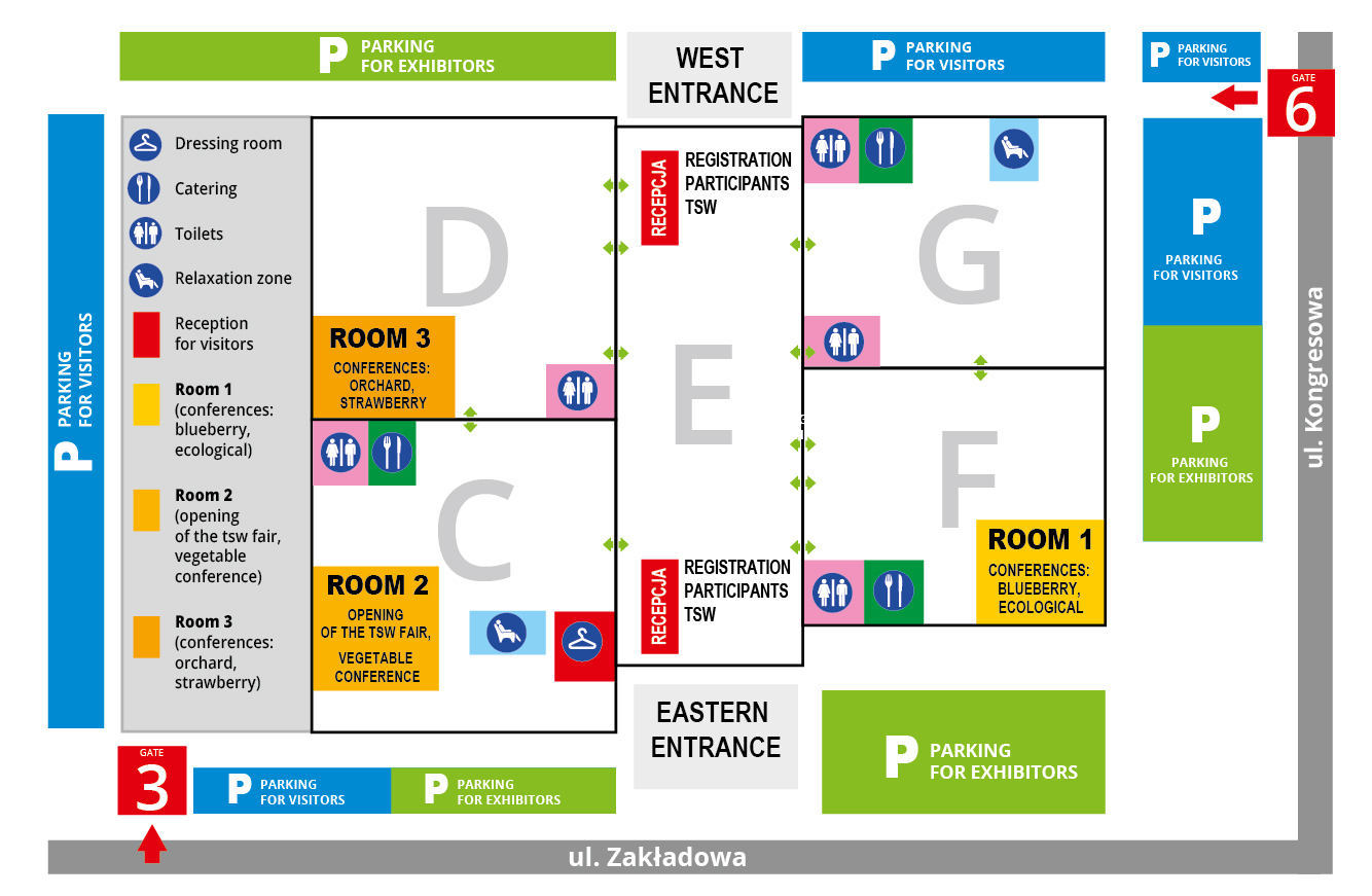 Participants will be able to enter the exhibition halls from two sides: the eastern and the western terminal.At both entrances, we have organized professional service points for participants, which will be at the guests' disposal as early as 1 hour (from 8.00) before the start of the event.We have marked both entrances to the facility on the attached plan.